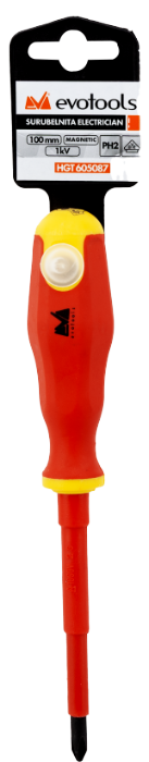 Acest tip de surubelnita EvoTools are partea utila confectionata din otel Cr-V de cea mai buna calitate, tratat termic, fiind acoperita de un strat izolator de polipropilena. Varful magnetic va ofera o fixare buna a surubului, eliminand riscul ca surubul sa ajunga in zone greu accesibile, reducand riscul accidentelor electrice. Manerul confectionat din polipropilena de inalta calitate va ofera o priza optima si confort in timpul utilizarii. Surubelnita este fabricata conform standardului european EN 60900 (VDE) pentru a va oferi o protectie electrica de pana la 1000 V (1 KV).